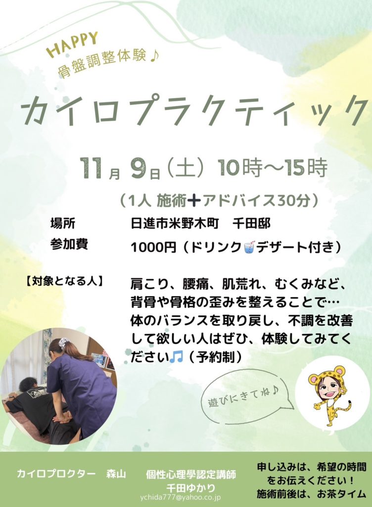 HOME > イベント > イベント 11月9日 カイロプラクティックコラボ 2024年10月2日 カイロプラクティックさんとのコラボ企画(!)普段から、骨盤の歪みを感じている方、多いんじゃないでしょうか!ぜひ、今回は特別価格✨破格値で整えてもらえるチャンスです🎵時間制なので…希望の時間帯をお伝えください。施術前後は、私とおやつを食べながら🍪個性心理學のお話しましょう😊 イベント参加ご希望の方はこちらからご連絡ください Post Share Pocket Hatena Pinterest LINE URLコピー -イベント