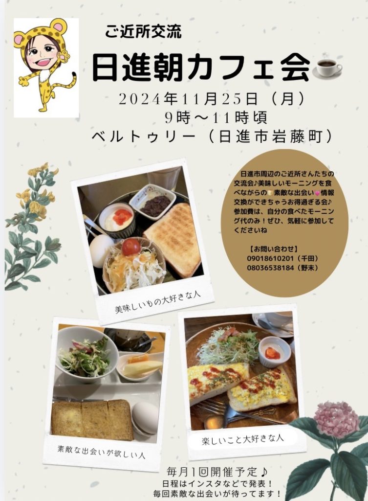 HOME > イベント > イベント 11月25日 日進朝カフェ会 2024年12月24日 11月25日(月)9時〜11時【日進朝カフェ会☕️】 毎月開催!モーニングを食べながらの交流会!会費無し!地元の方々と繋がるチャンスです。 今回の場所は「ベルトゥリー」になります! 住所:日進市岩藤町夏焼837-1 イベント参加ご希望の方はこちらからご連絡ください Post Share Pocket Hatena Pinterest LINE URLコピー -イベント
