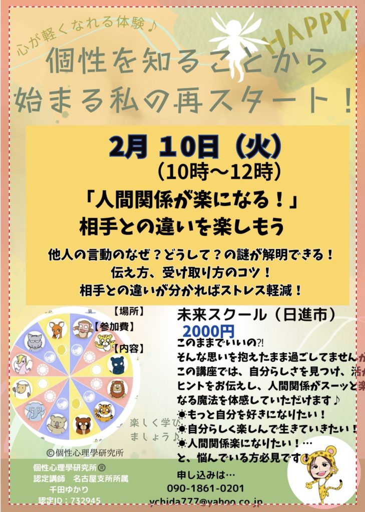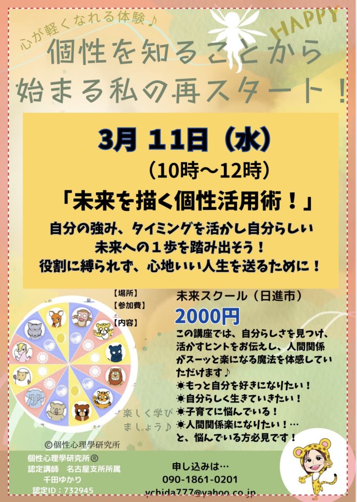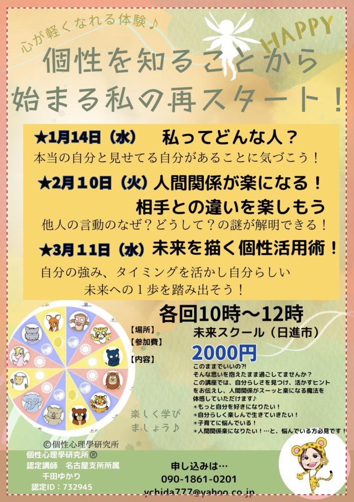 HOME > イベント > イベント 1〜3月開講 個性を知ることから始まる私の再スタート 2025年11月24日 2026年1月〜3月未来スクールで開催! 自分を知り、素敵に1年にしましょう♫ イベント参加ご希望の方はこちらからご連絡ください Post Share Pocket Hatena Pinterest LINE URLコピー -イベント