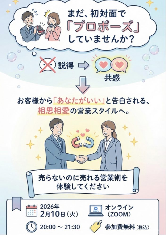 HOME > イベント > イベント 2月10日 オンライン交流会 2026年1月26日 売らないのに売れる営業術を体験できます。 イベント参加ご希望の方はこちらからご連絡ください Post Share Pocket Hatena Pinterest LINE URLコピー -イベント