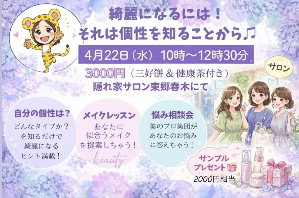 HOME > イベント > イベント 4月22日 綺麗になるには!それは個性を知ることから 2026年2月16日 綺麗になる色使い、アイテムにも個性がある! そんな学びをしながら…メイクのやり方を学べる講座です💄 イベント参加ご希望の方はこちらからご連絡ください Post Share Pocket Hatena Pinterest LINE URLコピー -イベント