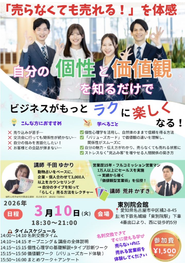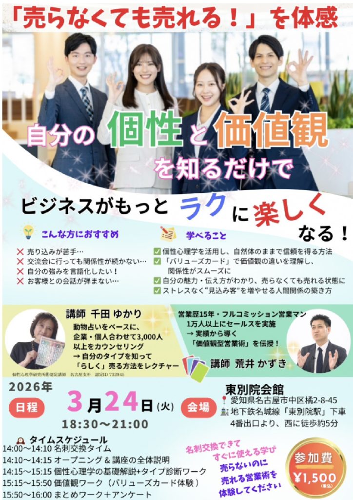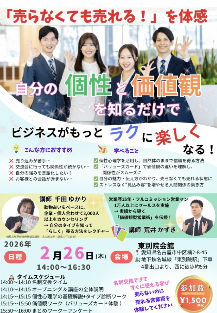 HOME > 講演会・セミナー > 講演会・セミナー 2月26日 3月10日&24日 学べる交流会 2026年2月16日 学べる交流会!東別院会館で、私の個性心理學講座が聞けて、価値観の違いを実感できて、交流までできてしまうお得な交流会です🉐 イベント参加ご希望の方はこちらからご連絡ください Post Share Pocket Hatena Pinterest LINE URLコピー -講演会・セミナー